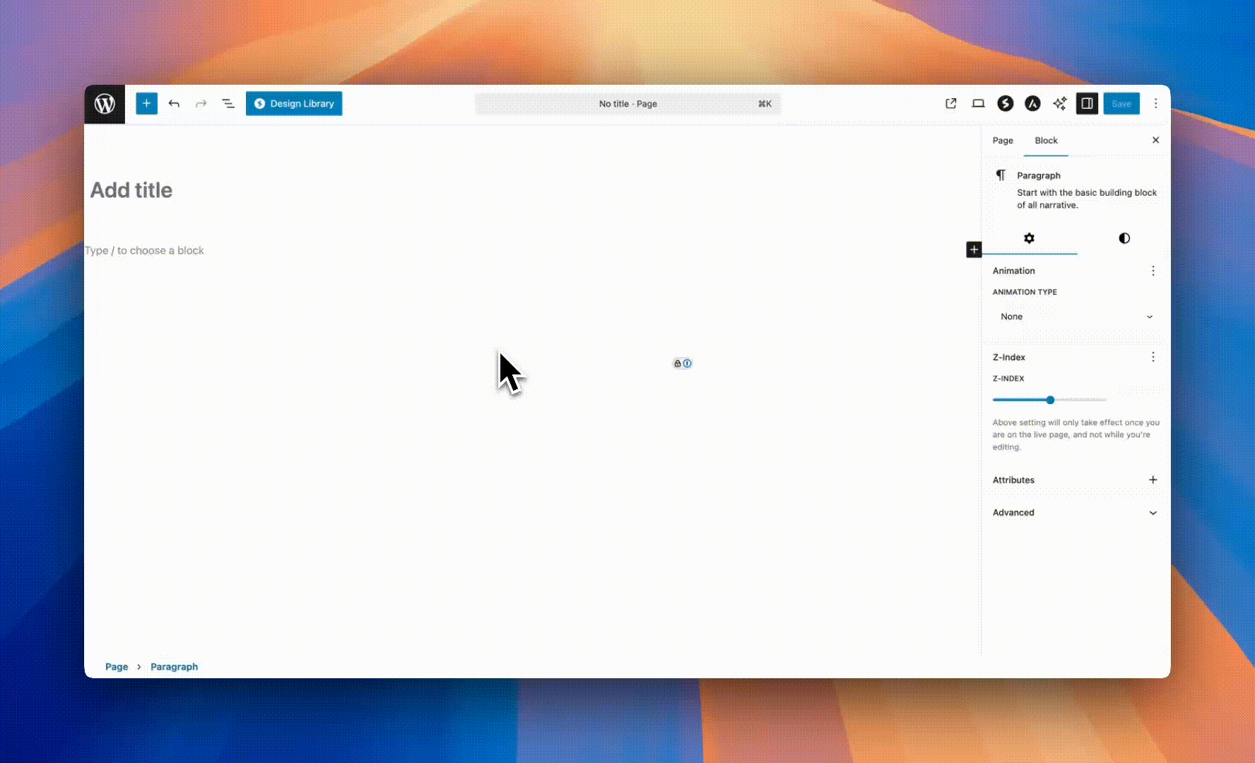 - Click inside the content area to add blocks
