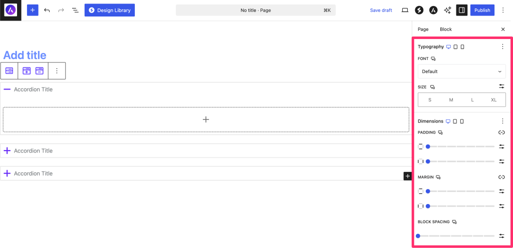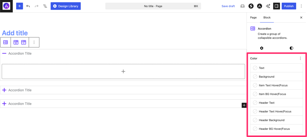 - The block automatically creates 3 accordion items to start