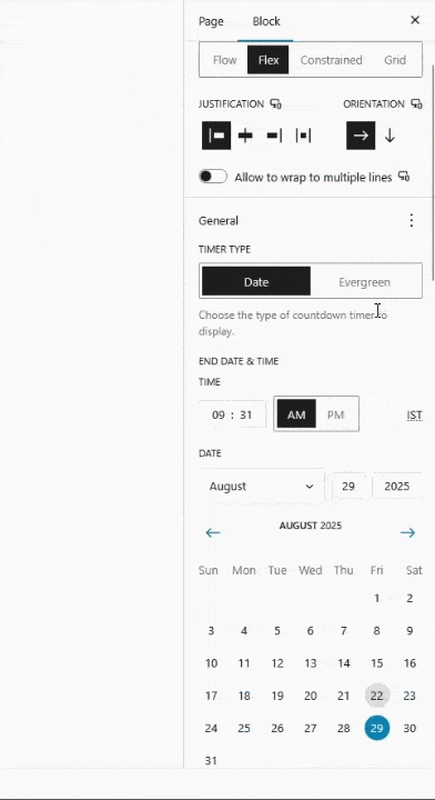 The block automatically creates a 7-day countdown. Set your target date in the “End Date & Time” setting and customize as needed.