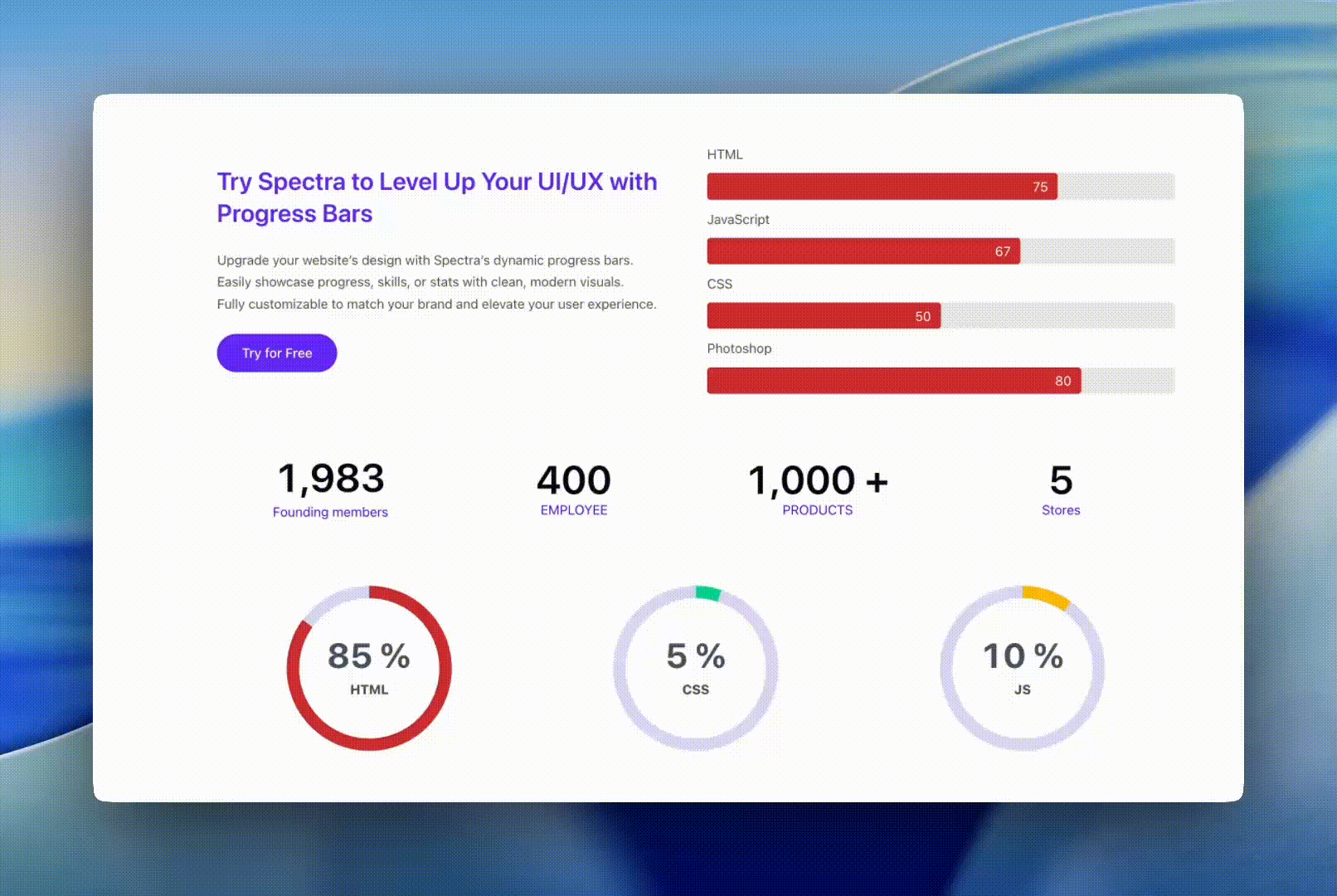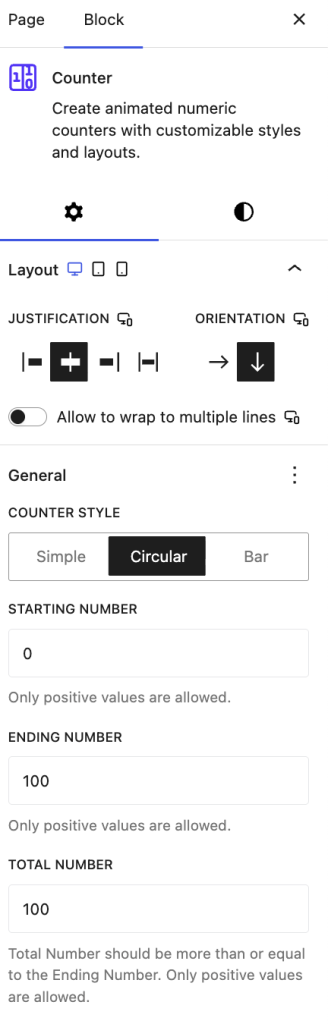 The Counter Block brings your statistics to life with animated numbers and progress visualizations. Whether you’re showcasing website visitors, sales achievements, project completion, or any data metrics, this block makes your numbers eye-catching and engaging. Choose from three distinct stylesโSimple numbers, Circular progress rings, or Horizontal progress barsโto perfectly match your design needs.