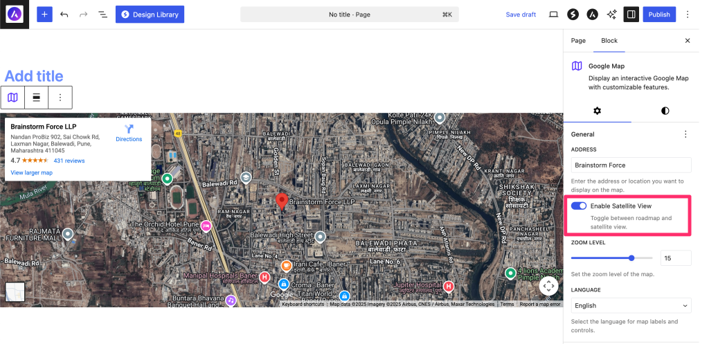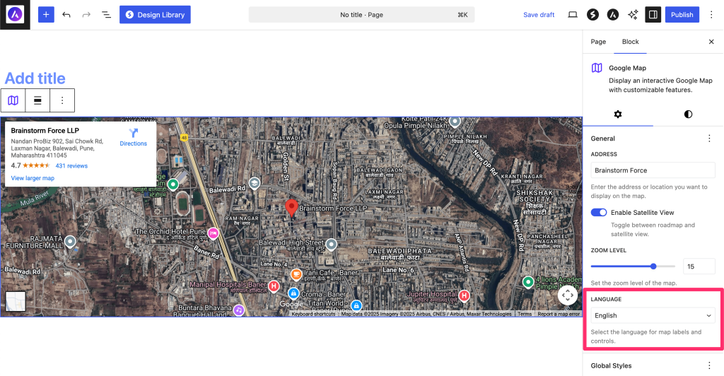 The block offers extensive customization options including satellite view, multiple language support, and responsive controls.