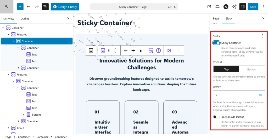 - Select a Container block in the editor (the one you want to stick)